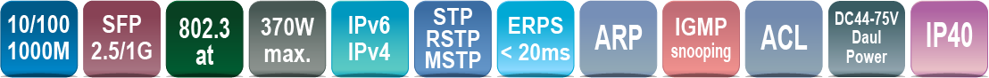- Layer 2 features: VLAN; ERPS, STP/RSTP/MSTP; Link aggregation, IGMP snooping, port mirroring, QinQ, 802.1X, port isolation, RMON, NTP client, DHCP snooping/client, Ping/Tracert test, ACL, QoS and SFP DDM function