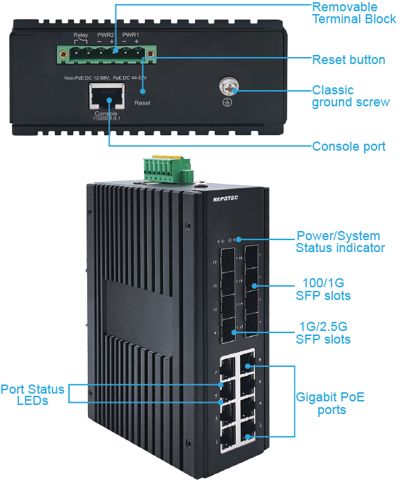 RP-IPG6308I-8F supports ERPS redundant network and the self-recovery mechanism is less than 20ms on full load which allows you to scheme a reliable Ethernet network by building a redundant ring topology as your back-up solution., The switch also support Layer 3 static routing and robust management features. With wide range voltage input 44-57VDC and redundant power design, it is ideal for large-scale industrial networks.