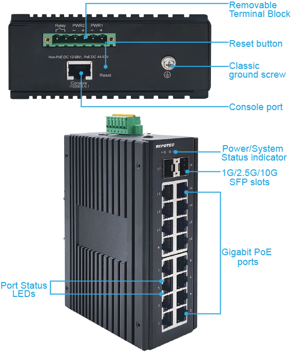 The RP-IPG6516IX-2F is a highly reliable Layer 3 managed industrial PoE switch featuring 16-port 10/100/1000-T RJ45 and 2-port 10GBase-X SFP+ interfaces. It complies with IEEE802.3af and IEEE802.3at PoE standards, with a maximum power consumption of up to 30W (PoE+) per port. With full gigabit downlink and 10G uplink capabilities, it ensures high-performance data transfer across industrial networks.