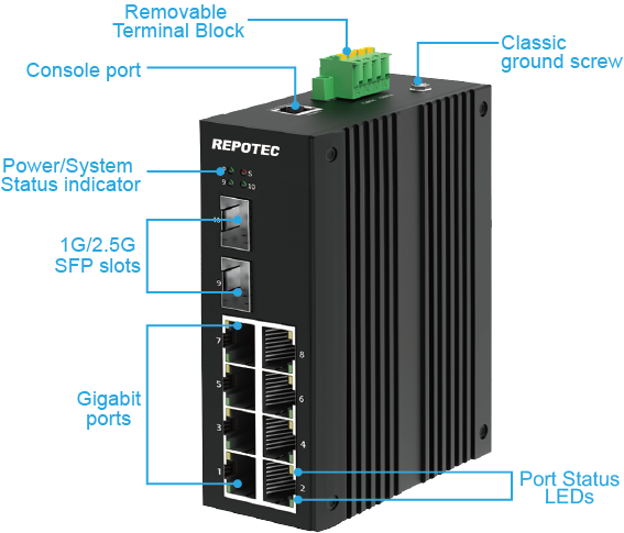 - 8*10/100/1000Base-T RJ45 ports, 2*1G/2.5GBase-X SFP ports