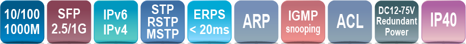 - Layer 2 features: VLAN; ERPS, STP/RSTP/MSTP; Link aggregation, IGMP snooping, port mirroring, QinQ, 802.1X, port isolation, RMON, NTP client, DHCP snooping/client, Ping/Tracert test, ACL, QoS and SFP DDM function
