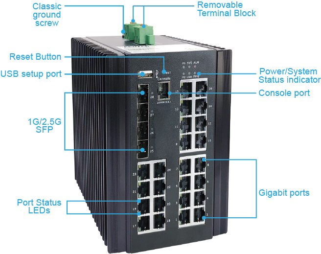 This model supports rich Layer 2 management features, including optional DI/DO/RS485 interfaces, G.8032 ERPS ring protection, MSTP/RSTP/STP redundancy, IPv4/IPv6 static routing, and a built-in DHCP server. With advanced network security and traffic control, it ensures stable and resilient connectivity for mission-critical networks.