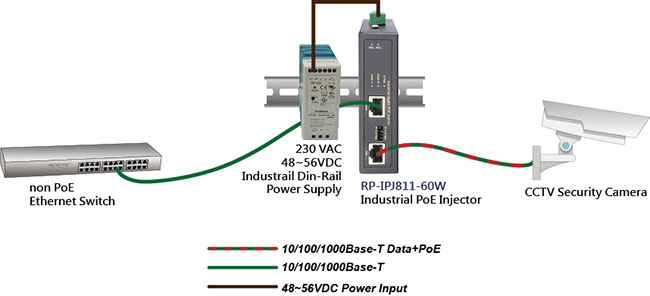 The RP-IPJ811-60W a high power single port Industrial POE Injector provides PoE power budget up to 60W. The device supports 10/100/1000Mbps data transmission and is powered with 48-56 Volts DC.