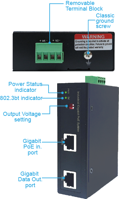 - 1x Gigabit TX for PoE IN + 1x Gigabit TX for DATA OUT
