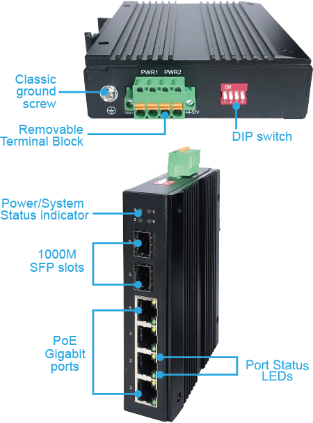 - DIP switch function: 1.Port isolation; 2. 250m long distance; 3. QoS; 4.PoE watchdog