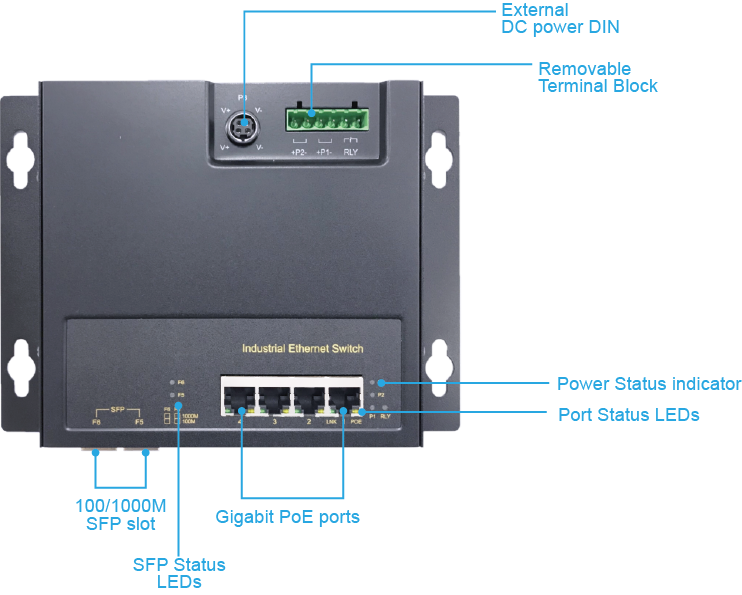 4-P Gigabit 802.3at PoE + 2-100/1000M SFP Industrial Gigabit Flat type Switch