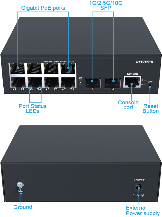 RP-PG83080IX-2F is a Layer 2 gigabit managed PoE switch with 8-port 10/100/1000Base-T RJ45 PoE ports and 2*1G/2.5G/10G SFP ports. Its powerful Layer 2 management and high-performance switching offer a cost-effective Gigabit Ethernet solution for enterprise networks.