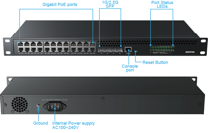| RP-PG83240I-4F-S | 24-P Gigabit + 4-SFP(1G/2.5G) slot L2+ Managed PoE Switch (250W) |