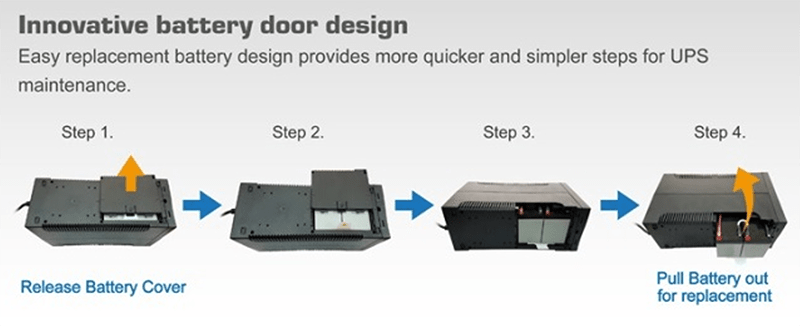 Experience hassle-free maintenance with the RPT-57xxDU series. The battery sliding door design allows for easy replacement, simplifying upkeep procedures. This convenient feature saves time and effort, ensuring your UPS is always ready to provide reliable power protection. Choose the RPT-57xxDU for a cost-effective, dependable power supply solution that safeguards your devices and prevents data loss during power failures.