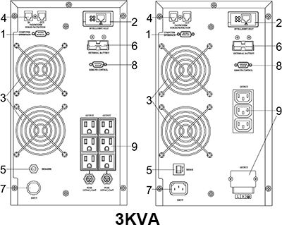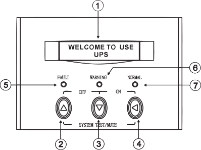 | Indicator | LCD | UPS status, I/P&O/P Voltage & Frequency, Load %, Battery Voltage, Battery Capacity %, Temperature, Model Spec., Event Log. | ||